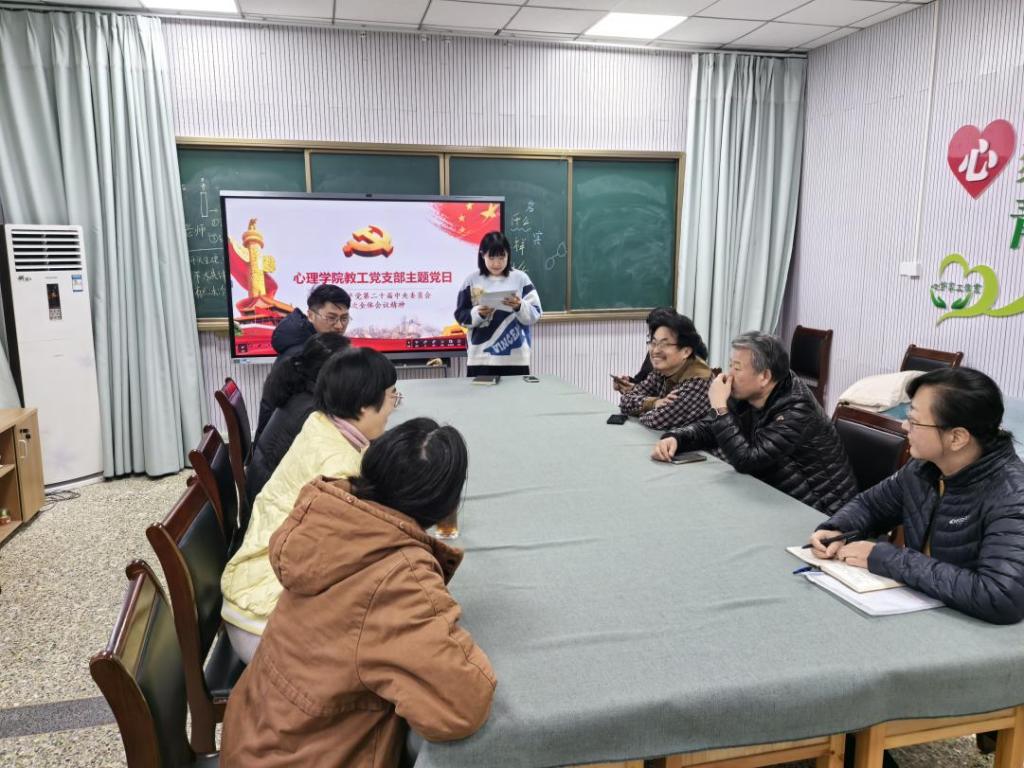 )为深入学习贯彻党的二十届四中全会精神,2025年12月3日下午3时,心理学院教工党支部于学院312会议室召开主题党日活动,集中学习《中国共产党第二十届中央委员会第四次全体会议公报》。活动由教工党支部书记吕邈主持,支部全体党员参会,通过系统领学与深度研讨,引导党员精准把握全会重大意义、丰富内涵及实践要求,进一步凝聚思想共识、明晰前进方向、强化责任担当。