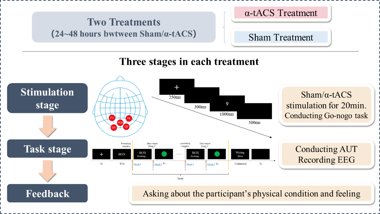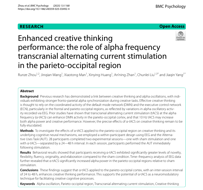 Zhou, R., Wang, J., Man, X., Huang, X., Zhang, A., Liu, C., & Yang, J. (2025). Enhanced creative thinking performance: the role of alpha frequency transcranial alternating current stimulation in the parieto-occipital region. BMC Psychology, 13, 1168.