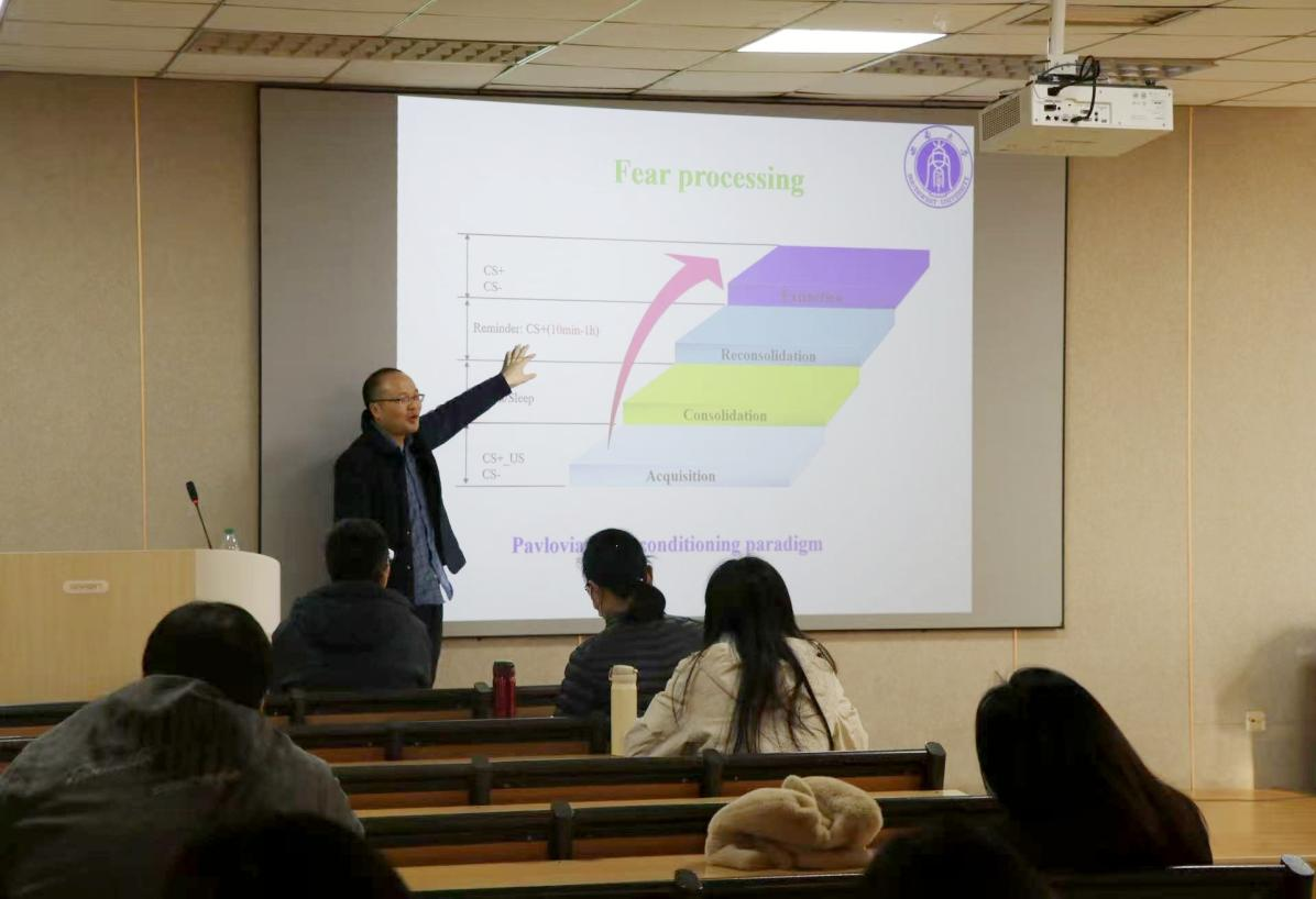 讲座伊始,冯攀老师介绍了恐惧情绪加工这一研究方向的重要意义。他指出,消极情绪如恐惧需要科学干预,以帮助经历创伤事件的人群恢复心理健康。他分享了一个真实案例:一名小学生因观看手撕鬼子视频产生严重恐惧,通过先唤醒其恐惧记忆再进行认知纠正的方法成功缓解症状,这让在场师生深刻认识到恐惧干预的现实价值。